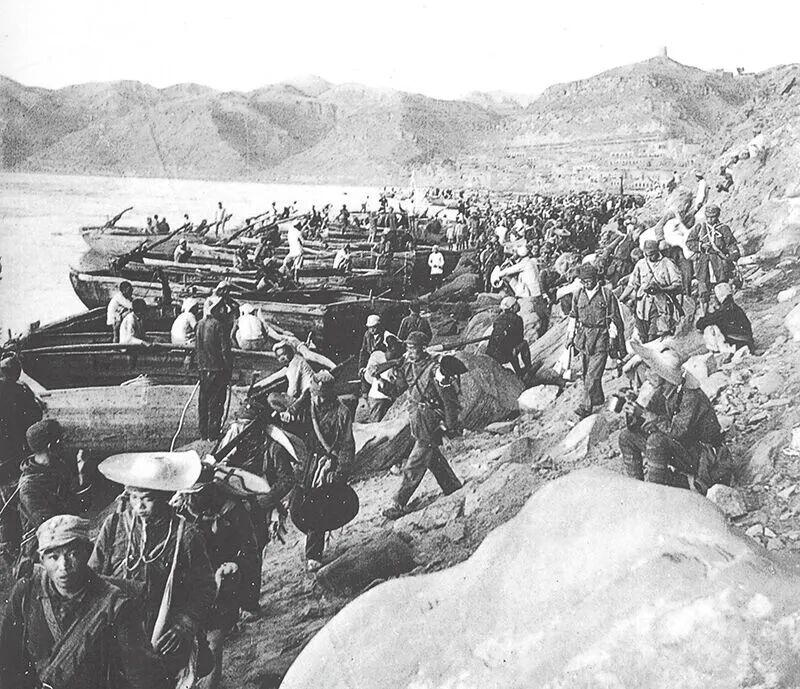 1937年全国抗战爆发后,中国共产党领导以八路军、新四军、东北抗日联军、华南游击队为主的抗日军民,与日军展开了殊死的斗争,并取得最终胜利。图为1937年八路军东渡黄河开赴抗日前线。