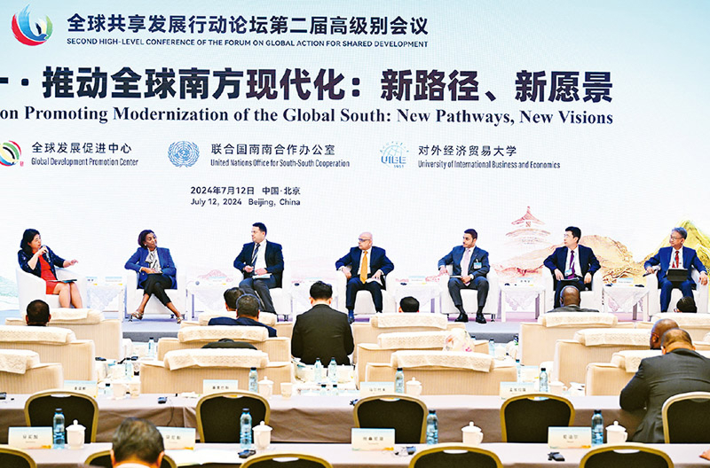 2024年7月11日至13日,全球共享发展行动论坛第二届高级别会议在北京举行,来自160多个国家、国际组织和其他机构的代表参会交流研讨。本届会议下设“推动全球南方现代化”等5场平行分论坛。图为7月12日,“分论坛一·推动全球南方现代化:新路径、新愿景”专题研讨环节。 中新社记者 田雨昊/摄