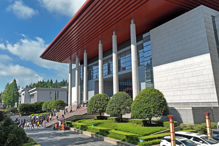 游客进入井冈山革命博物馆参观(2023年6月28日摄,无人机照片)。新华社记者 万象 摄