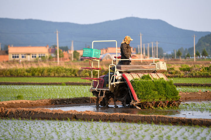 在吉林省吉林市永吉县鑫丰种植农民专业合作社,农民驾驶农机进行水稻插秧(2025年5月26日摄)。新华社记者 张楠 摄