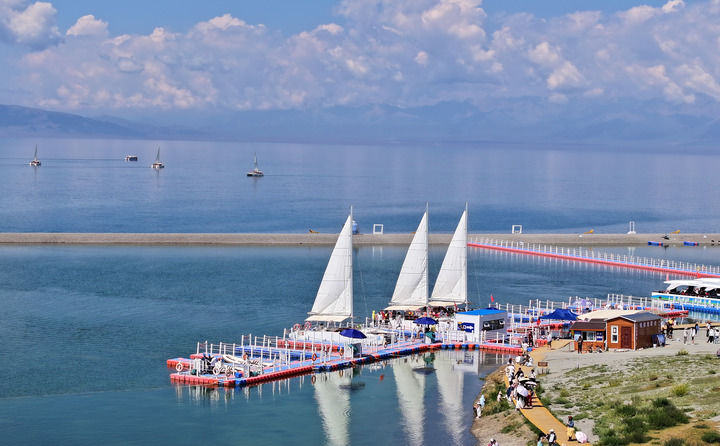 这是2025年7月17日在新疆博尔塔拉蒙古自治州赛里木湖景区拍摄的电动帆船游玩项目(无人机照片)。新华社发(张利民摄)