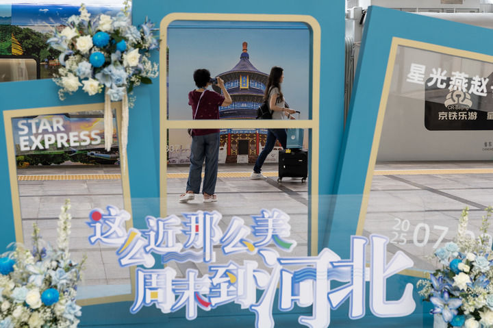 2025年7月9日,在北京站,旅客在京津冀首列观光旅游列车“星光·燕赵号”旁留影。新华社记者 白雪飞 摄