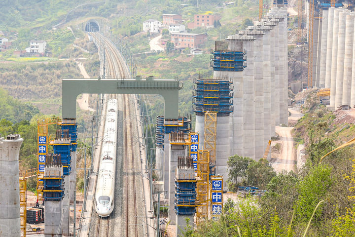 2025年3月27日,在成达万高铁左线福寿跨渝万城际特大桥项目施工现场,成达万高铁首个跨既有高铁钢横梁吊装完成,郑渝高铁线上一列动车从门式墩钢横梁下通过。新华社发(黄茂程摄)