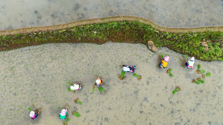 2025年5月2日,在云南省红河县甲寅村,村民在梯田里插秧(无人机照片)。新华社记者 胡超 摄