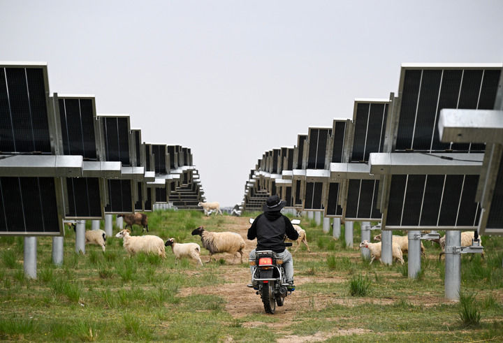 2025年6月18日,牧民在位于青海省海南藏族自治州的青海黄河上游水电开发有限责任公司共和光伏产业园放羊。该光伏产业园推广“光伏+生态”模式,将昔日荒滩变成牧场。新华社记者 金良快 摄