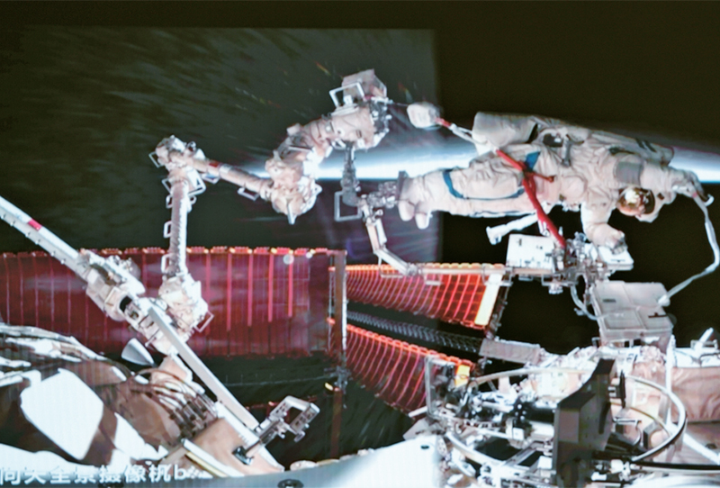 2024年,“神舟”飞天、“北斗”组网、“嫦娥”探月、“天眼”巡空……创新驱动的“中国号”向着科技强国的目标奋勇前进。图为2025年1月20日在北京航天飞行控制中心拍摄的神舟十九号航天员宋令东在空间站组合体舱外工作的画面。 新华社记者 刘芳/摄