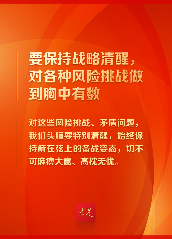 “推进中国式现代化,是一项前无古人的开创性事业,必然会遇到各种可以预料和难以预料的风险挑战、艰难险阻甚至惊涛骇浪,必须增强忧患意识,坚持底线思维,居安思危、未雨绸缪,敢于斗争、善于斗争,通过顽强斗争打开事业发展新天地。”