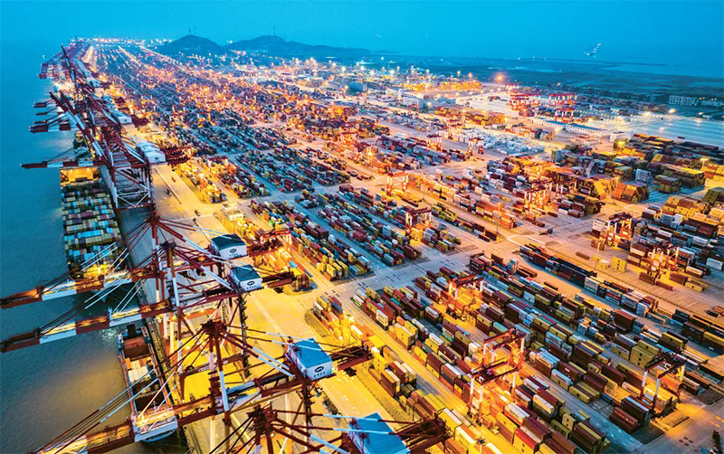 图为2024年10月18日,桥吊林立的上海港洋山深水港区作业繁忙有序。人民图片 计海新/摄