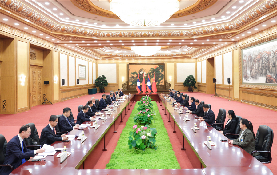 9月4日上午,中共中央总书记、国家主席习近平在北京人民大会堂会见来华出席2025年上海合作组织峰会和纪念中国人民抗日战争暨世界反法西斯战争胜利80周年活动并进行工作访问的老挝人民革命党中央总书记、国家主席通伦。新华社记者 丁林 摄