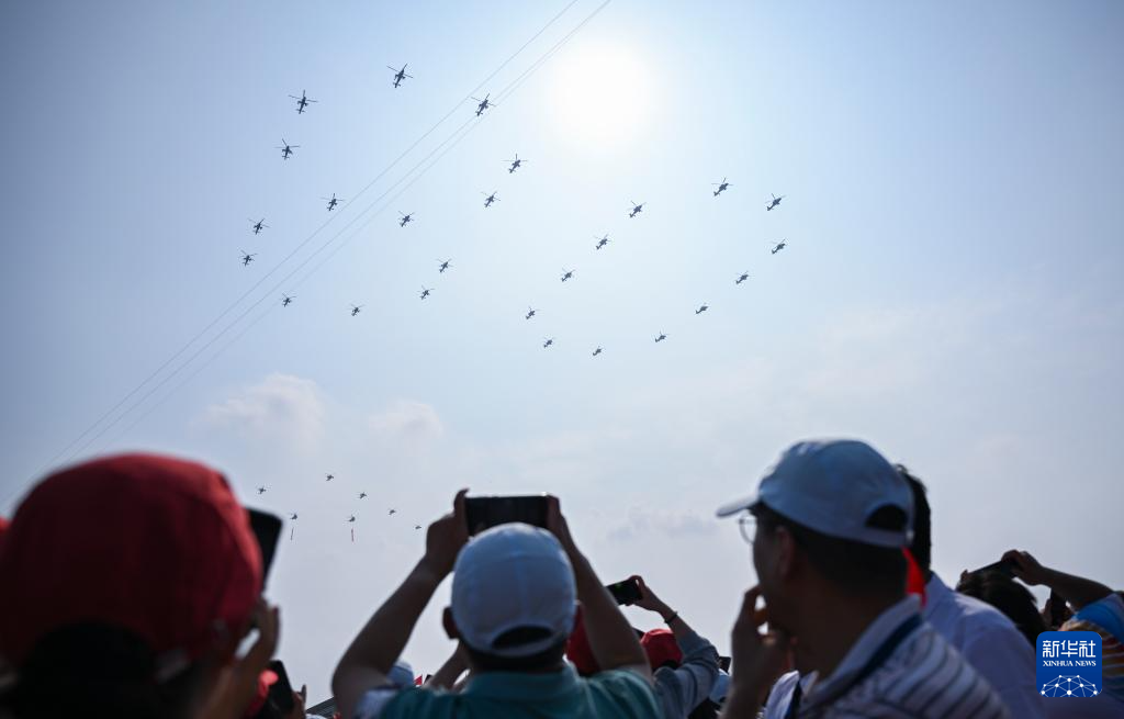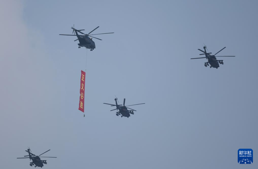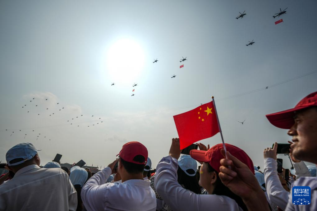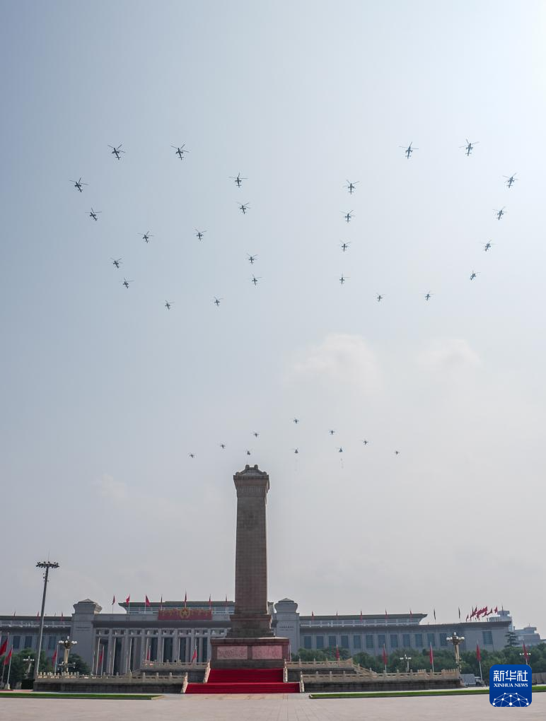 9月3日,纪念中国人民抗日战争暨世界反法西斯战争胜利80周年大会在北京隆重举行。这是空中护旗梯队飞过天安门广场上空,26架直升机汇成巨大的“80”字样。