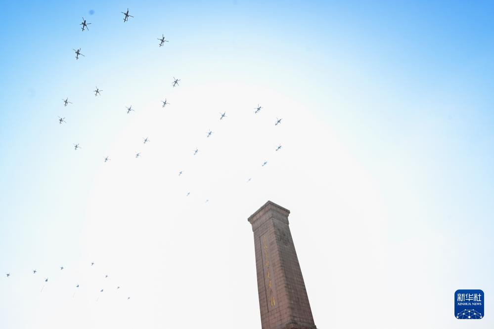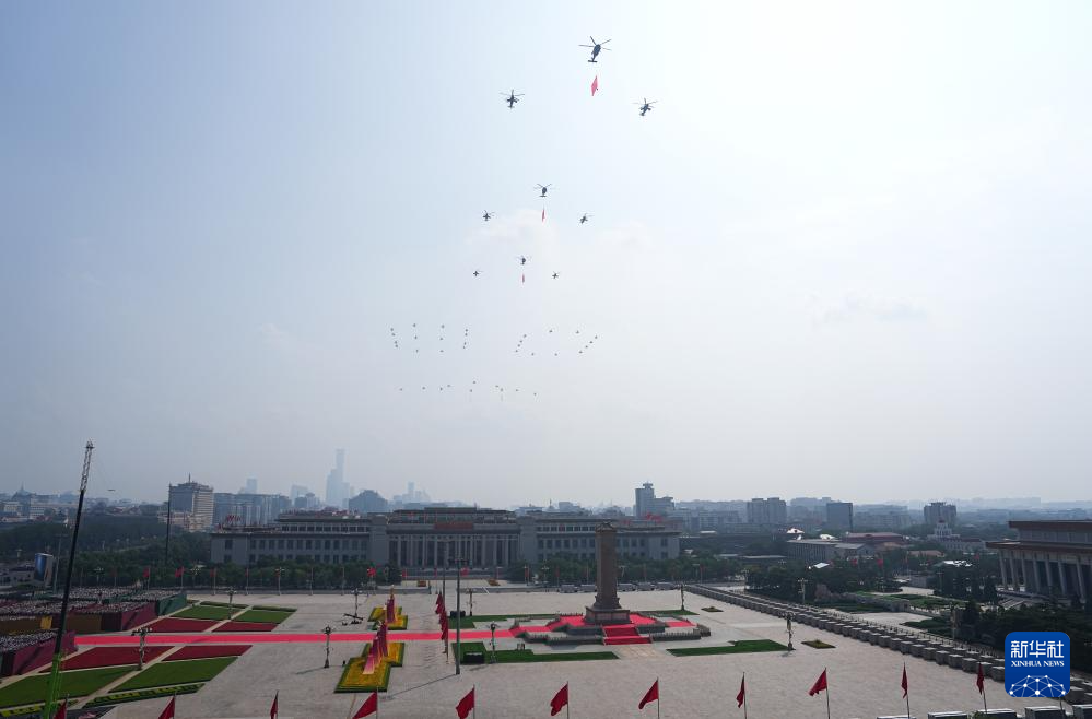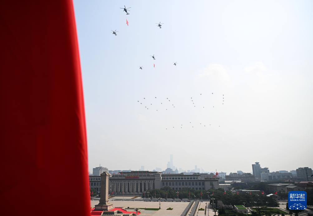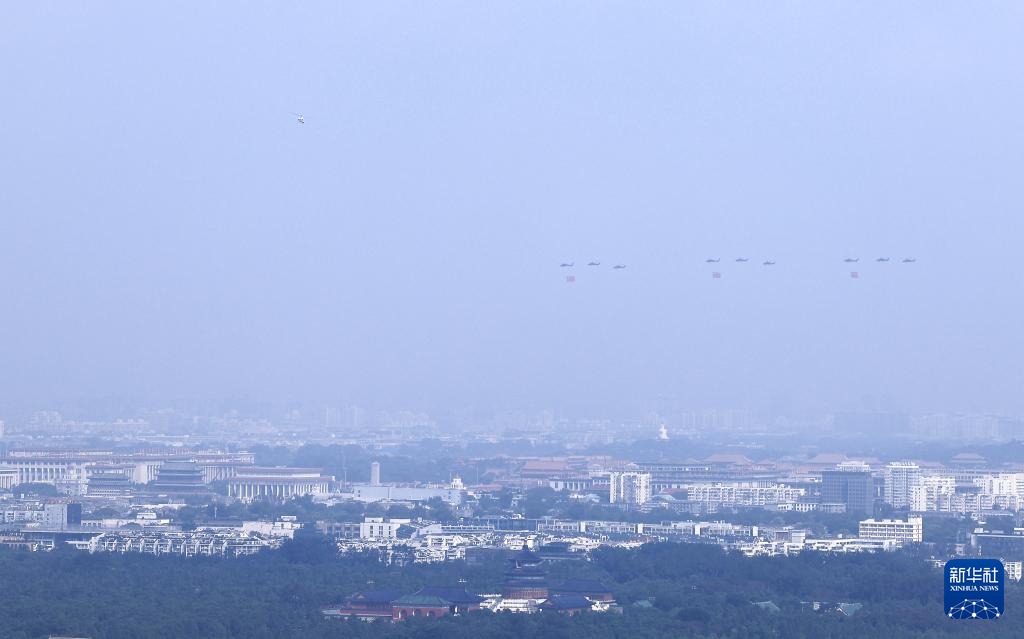 9月3日,纪念中国人民抗日战争暨世界反法西斯战争胜利80周年大会在北京隆重举行。这是空中护旗梯队飞过天安门广场上空。