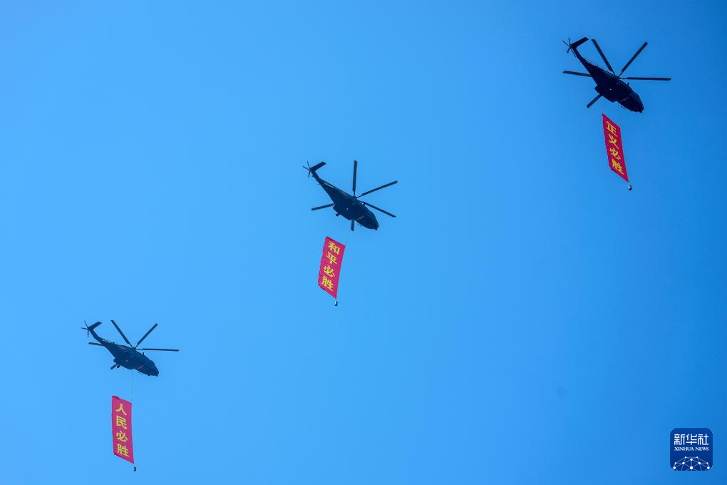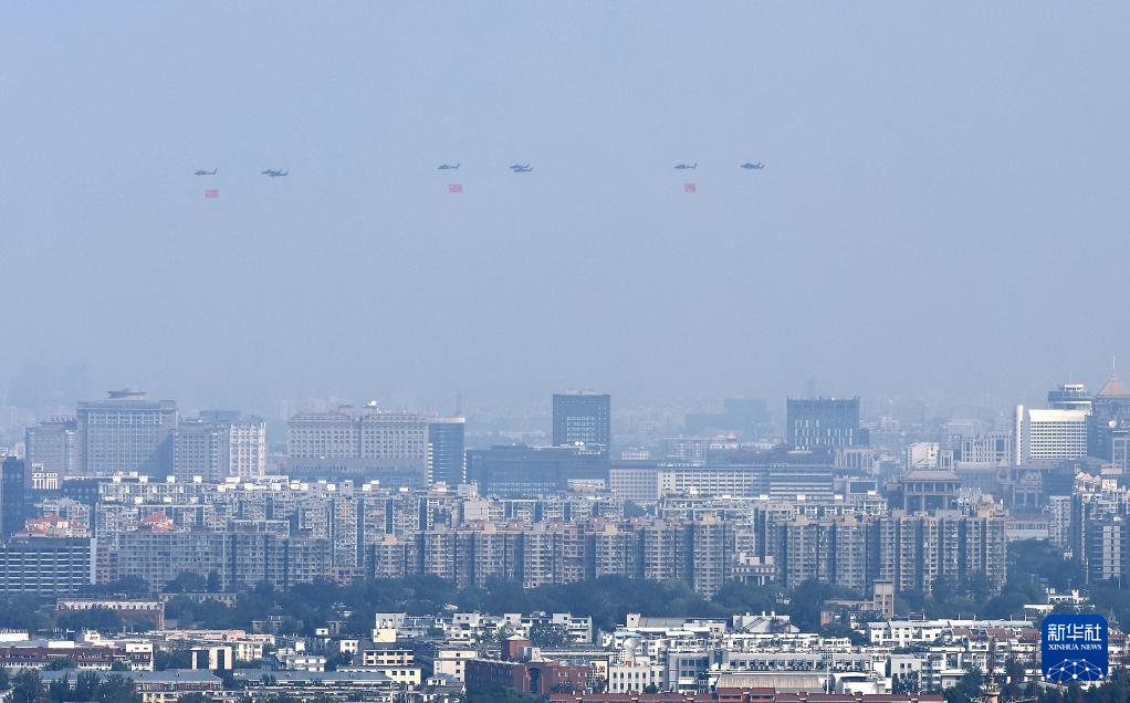 9月3日,纪念中国人民抗日战争暨世界反法西斯战争胜利80周年大会在北京隆重举行。这是空中护旗梯队通过天安门广场。