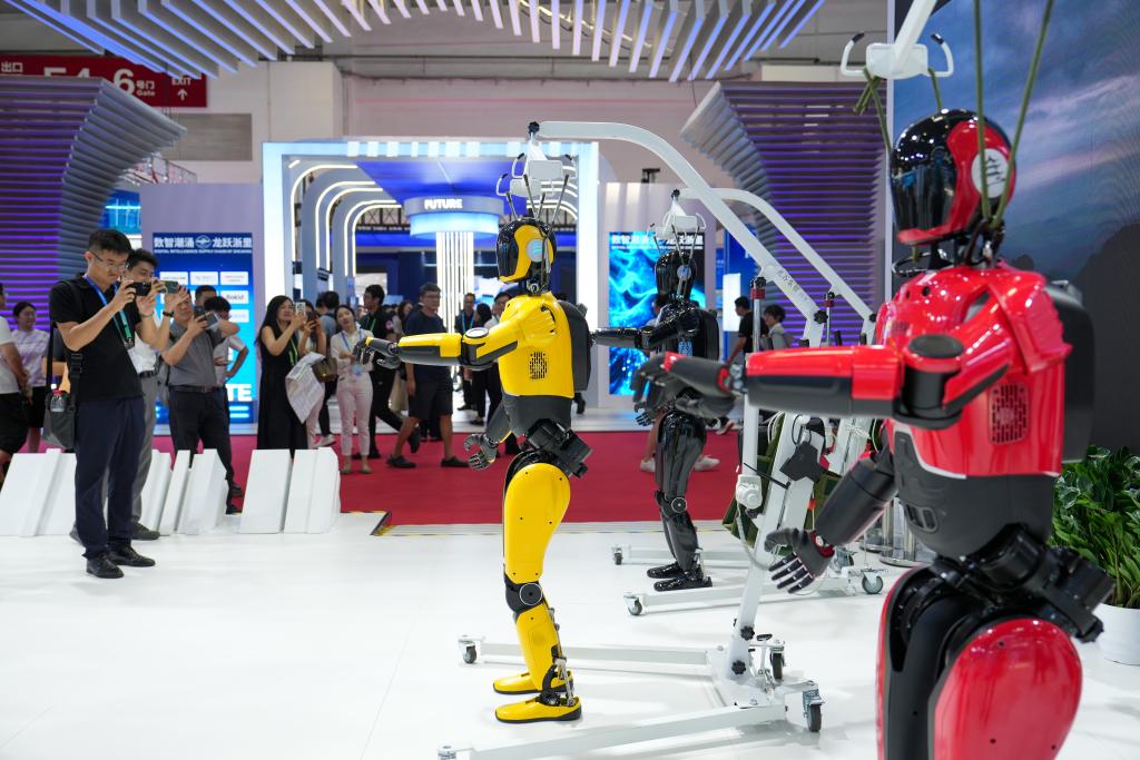 7月17日,在第三届链博会数字科技链展区,参观者观看人形机器人表演。新华社记者 鞠焕宗 摄