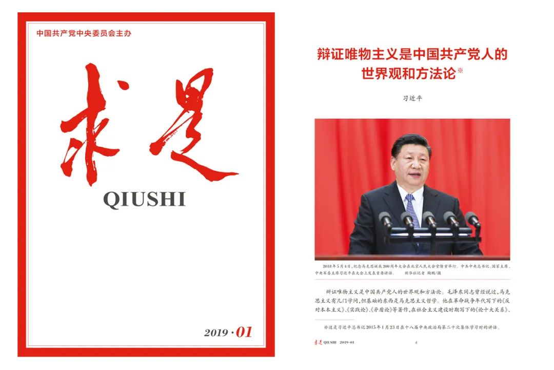 《求是》杂志自2019年第1期起全面改版,图为改版后的首期杂志封面和当期刊发的习近平总书记重要文章首页。