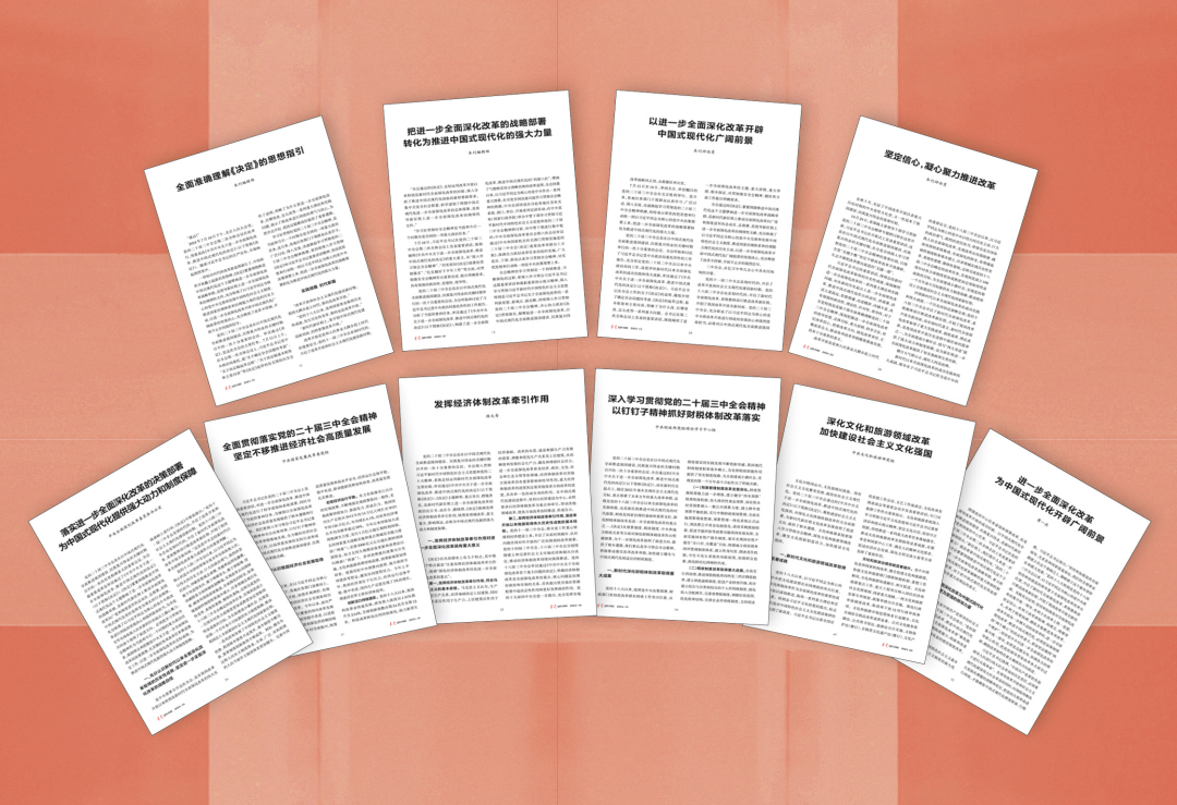 图为2024年《求是》杂志围绕学习贯彻党的二十届三中全会精神策划推出的部分重点宣传阐释文章首页。
