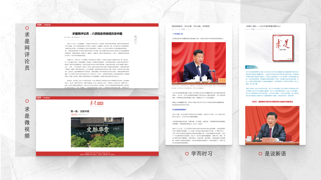 图为求是杂志社着力打造的“求是网评论员”、“学而时习”、“是说新语”、“求是微视频”等融媒体特色品牌。